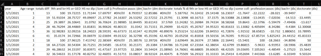 We did a lot of cleaning on the Census data with the way we got it. I broke down a lot of the formatting, took things through educational levels and eventually put them in their own separate excel sheets. My partner was able to come up with a couple of columns that better defined the gender pay gap as we saw it in the dataset, and I applied those to the rest of the data. Then, I created my own csv with the formula for those new columns, applied to the other educational levels. So that new csv was just those two columns across all educational levels…