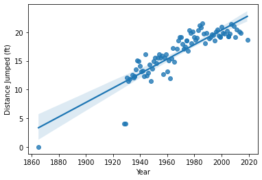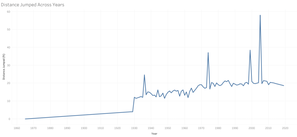 The viz above shows the distances jumped across the years, and how it’s changed and where the trend is at the moment. The harder spikes represent the world record holders, of which there are 13 total recorded.