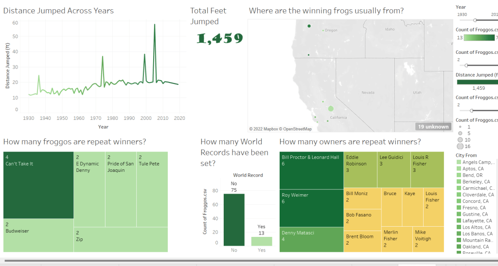 I didn’t get a froggy image in there like I wanted to originally, but I really love the layout and how this ultimately turned out. It’s fully interactive with filters to help keep the data clean, you can play with it here.
